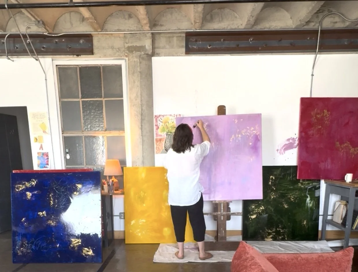 Sam Hopwood is a painter and writer exploring color as a companion/presence — queer abstraction with resin, texture, and gold leaf, building a cosmic-intimate surface.